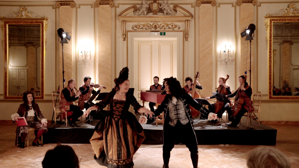 Le Maître de danse et le Maître de musique échangent avec humour autour du personnage de Lully, et quelques spectateurs volontaires sont amenés à participer à des pas de danse sur scène.